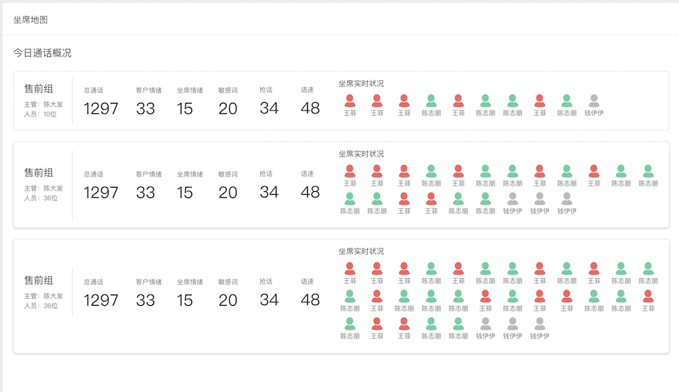 座席辅助系统,不仅可以针对某一通通话完成知识推荐,流程状态导航,通话状态的监测,还可以针对管理者还可以从宏观的层面输出座席工作人员的全部通话报表,方便管理人员查看,这样的视图我们将称为座席地图,如下图所示。