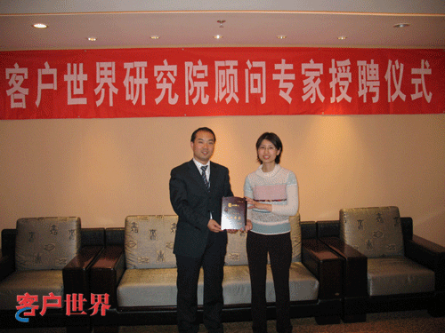 2006年12月8日,北京。[客户世界消息]借举办“2006(第二届)中国客户关怀大会”的机会,客户世界机构(CCMWorld Group)今天举行正式仪式,聘请业界知名专家孙媛女士为其旗下客户世界研究院(CCMWorld Academy)顾问专家,以加强研究院在呼叫中心运营管理研究领域的研究能力和行业指导能力。客户世界机构创办人赵溪先生主持了今天的聘任仪式。