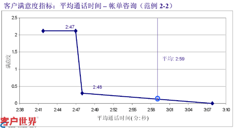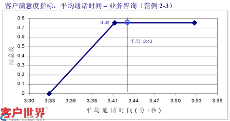 当然,对客户的不同需求的服务也不能用过于简单的同一模型来进行分析,因为呼叫中心不同类型服务的客户感知是不一样的。比如说,客服中心接到的咨询电话的平均通话时间是影响客户满意度的一个很重要的指标。但对于帐单咨询和业务咨询(产品或服务)的平均通话时间,就需要用不同的模型分析来找出什么是最优化的平均通话时间。例如,某大型企业的客服中心的平均通话时间为3分01秒,我们通过模型分析,试图找出最佳的平均通话时间(见下图:范例2-1)。