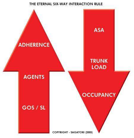 以Inbound坐席员为例,SAGATORI提出的KPI就只有两个:日程遵守度和质量。这里边首先包含了对呼叫中心运行逻辑和动力传递机制的透彻理解。SAGATORI把它总结为“呼叫中心永恒不变的6条法则”,以下是一个简单图示(详细解释在此省略):