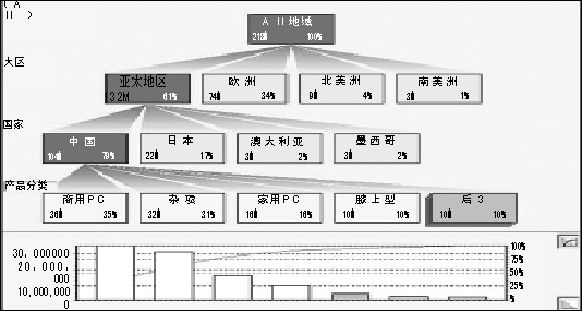 在图1中,可以对PC机在各个地域的销售额和所占百分比一目了然。任意一层分解树都可以根据不同维度随意展开。在该分解树中,在大区这一层是按国家展开,在国家这一层是按产品分类展开。