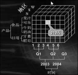 多维数据库的概念并不复杂。举一个例子,我们想描述2003年4月份可乐在北部地区销售额10万元时,牵扯到几个角度:时间、产品、地区。这些叫做维度。至于销售额,叫做度量值。当然,还有成本、利润等。
