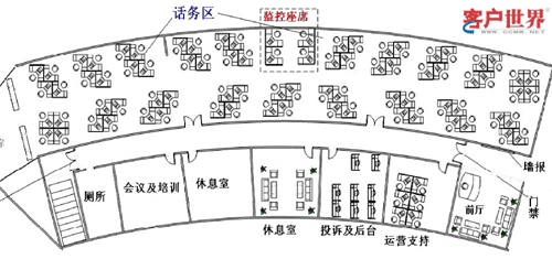 运营部工作区域是东方航空呼叫中心物理构成最主要的部分。主要分为前台、座席区、客户关怀组工作区、员工休闲活动区域及休息室、更衣室、会议室及运营管理办公室。