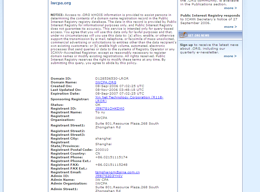 我预感这是一个新注册的网站,于是到美国的域名管理商“www.pir.org”上去进行whois的查询,真相大白,网站是“08-Sep-2006 07:02:25 UTC”注册的,注册人是“Tony”,地址是“Suite 801,Resource Plaza,268 South Zhongshan Rd”,