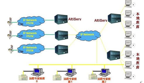 这种组合节省管理成本,因为所有的座席员都在一点,便于管理控制,同时用户只要拨打本地电话即可进入系统接收服务,如需人工座席应答的话系统会自动将来电通过Internet转接到座席员处,对公司的话费成本也较低(都是通过Internet实现的长途转接功能)。同时AltiGen也支持通过IP分机的方式远程登录到系统实现远程座席的功能,这样对有些高级话务员或专家座席,不必每天到公司上班,可以通过家里的电脑登录到AltiGen系统,作为系统的一个分机来完成所有的座席员的功能,在他的电脑屏幕上也能弹出来电人的信息。系统的组网图如下: