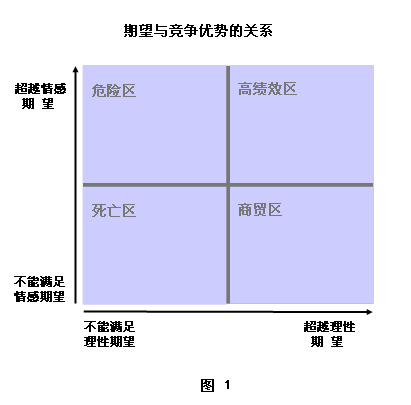 一般来说,横渡公司在优化理性元素上已做的不错。我敢说大部分专业运营公司对客户的理性期望已相当了解,并已采取相应措施取得了巨大的成果。但我也相信,这些公司几乎不理解客户的情感期望是什么。其实在竞争优势(就忠诚客户及保持客户长期交易而言)和客户期望之间有种独特的关系。我用图1的轴线图来说明3。图中清楚地表明,没有满足感性和理性两种期望的公司是在死亡区,发展趋势只有倒闭。多数大中型公司会在商贸区。通常,这类公司在理解客户理性期望的基础上采取优化理性元素的措施,取得了卓有成效地成功。然而,他们缺乏理解客户情感期望的方法,那么感性元素必然遭受忽视。在危险区域中也很难发现健康的公司,无论是何原因,相比对待理性元素,它们看来更为重视感性元素。在极致的区域(左上角)内,似乎代表了欺骗性的艺术家。他们让你痴迷,但在你找到时他们却突然消失,除了空气,你一无所获。值得一提的是,我不是如此草率的建议一家公司要偏爱感性元素而忽视理性元素。我希望是一个保持平衡的方法。总之,为了达到高绩效区,公司要不遗余力地保持情感元素和理性元素的一致性和有意作为。