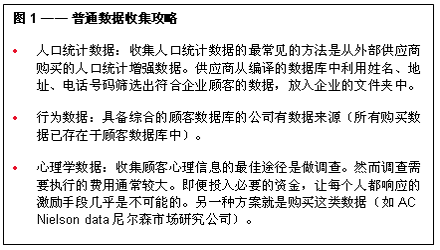 • 数据挖掘/行为模式:嵌入开展运动管理工具的分析预测技术可帮助营销人员把常规的细分(基于数据库领域的细分)转换为预测性的细分(基于数学运算法则的细分),开发“创新性”的细分。