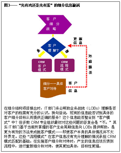 客户细分建立后,随之开发的CRM对待(客户模式)就会冲破障碍,获得渠道效力。不过,这里有一个“先有鸡还是先有蛋”的信息漩涡:尽管设计客户模式需要围绕客户需求,但多数组织没有充足的信息组建客户档案。这可能变成恶性循环——要想避免这种漩涡,意味着即使没有完善的信息,企业务必在互动中开始寻找机会收集信息,持续反复地更新细分/对待。