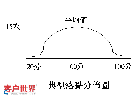 3、分数分布的形状:这就是概率学上的落点分布,一般分布的图形,都是一个倒放过来的钟,钟的顶端就是平均值。有人打出的图形,是一个少林寺的“椭圆钟”,有人是一个“方钟”(分数大部分集中在平均值附近),有人打出一个很扁很矮的“碗钟”。