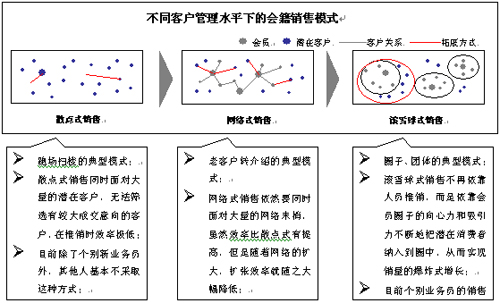 客户关系能帮助销售人员有效地跟踪所有销售过程,用自动化的处理过程代替原有的人工整理分析过程。事实上,高尔夫会籍的销售主要依靠老客户转介绍和口碑传播来进行。在这种情况下,客户管理水平决定了销售水平。在高尔夫会籍的演进方向上,不同的客户管理水平代表了不同的销售模式。