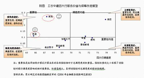四大行如何提升客户满意度,维护优质客户忠诚呢?《2006年金融服务指数研究报告》采用“零点服务价值与保障改进模型”对四大行服务水平和改进方向进行了分析,结果显示:“快速”和“默契”是两大短板,四大行应着力改进。