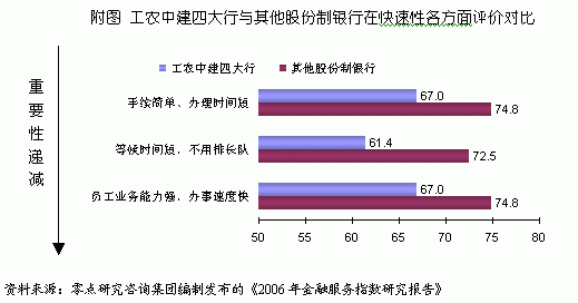 这里的“快速”是指客户希望银行服务迅速,“回眸之间”便一切办妥。人们生活节奏日益加快,能否最小化顾客的时间成本,成为衡量一个银行服务好坏的门槛指标。五大四大行虽然网点多,但由于客户量大,每个柜台服务压力较大,因此导致客户感知到的服务效率比较低。《2006年金融服务指数研究报告》中显示:与其他股份制银行相比,四大行在快速性的各方面评分都显著低于其他股份制银行,其中在等候时间上劣势尤其明显,两者得分差距达到了11分。
