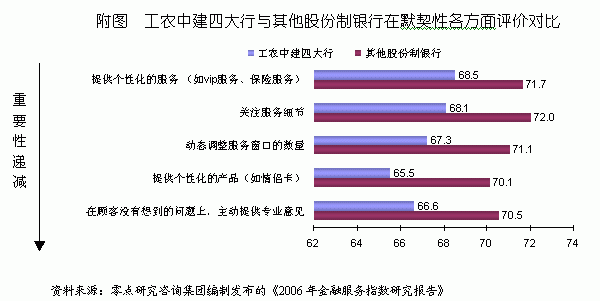 《2006年金融服务指数研究报告》中调查结果显示,对工农中建四大行服务满意度较高的“愉悦人群”主要是51-60岁的低端客户(低学历、低收入),而其它股份制银行则获得了相对更优质的中间客户(中等学历、中等收入)的青睐。这一方面反映了目前招行、浦发、民生等其它股份制银行“差异化精准定位”的策略做得比较成功,另一方面也说明了四大行服务离中高端客户的需求仍有相当差距,存在优质客户流失的潜在危险。