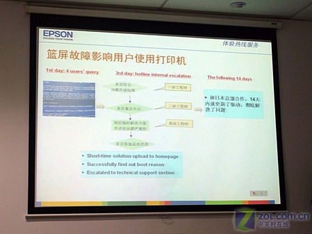 一天,爱普生热线服务中心接连收到了4位消费者打来的故障咨询电话,全部是反映只要一使用爱普生打印机就会出现电脑蓝屏现象,这一问题立即引起工程师们的警觉,当天就联系到了北京的一位消费者,并上门察看原因,但工程师在现场无法解决该问题,于是将用户的环境完全模拟到了服务中心的实验室中,但问题依旧存在,于是立即加派高级工程师作全面地检查,发现是驱动问题的原因,于是立即与日本总部合作,改进了驱动程序,问题迎刃而解,从问题的发现到彻底解决,仅用了15天时间。