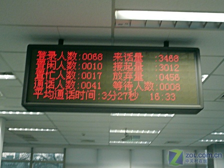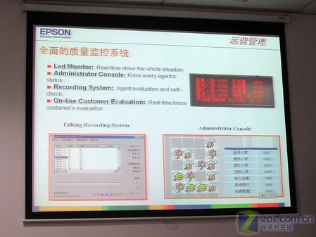 在1200多平方米的爱普生热线服务中心,有100多名工程师时刻解答用户的疑问,大厅正中央的位置悬挂着显示屏,整个通话系统的状态一览无余,登录人数,接入话量,空闲人数甚者等待用户,平均通话时间等信息都可以清晰地反映在显示屏上。