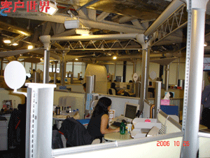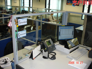 由于吊顶较高,座席间距也较大,话房的噪音较小。员工的桌子十分整洁;键盘托架可随意调整高度;椅子是符合人体工学的品种;显示器侧面专门有一个粘钩用来悬挂耳麦;桌面下有专门定制的多层抽屉,可180度展开,像莲花瓣一样,可存放其它办公用品。主管或者班长的桌旁还有一块悬在侧面的白板,用来召开一些临时会议,或者小组讨论,备忘录等。舒适开阔的办公环境让员工时刻保持愉快高涨的工作热情和信心。