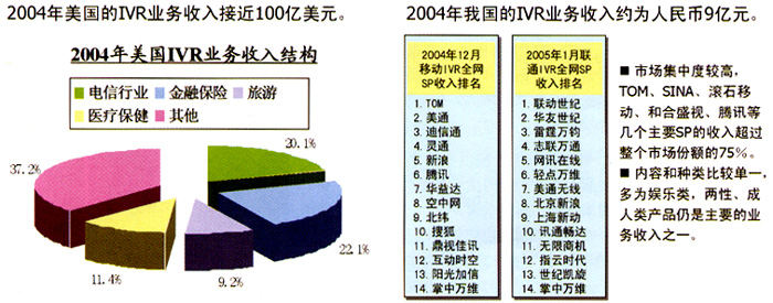 总之,借鉴国际经验,考虑本国实情,笔者认为,今后国内IVR的业务结构将会逐步在发展中得到改善,虽然说针对个人提供的语音娱乐类、点播类业务在近期仍会占主体,但信息咨询类、行业应用类和数据类业务的比例将会逐步提高,而形式、内容相对空泛的游戏答题类业务在经过近两年的繁荣期后,占比和规模都将会逐步回落到一个稳定的水平。
