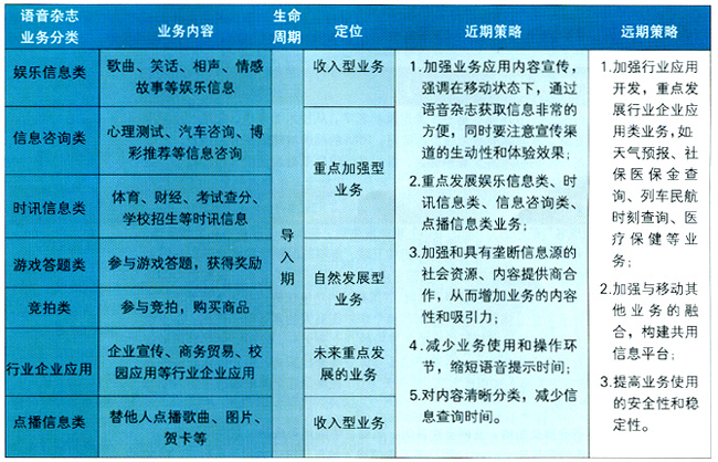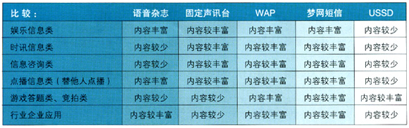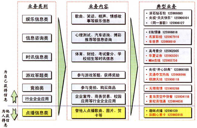 - 时讯信息类和信息咨询类业务,IVR优势较强,但业务范围较窄,内容较少,收入贡献较低,同时部分业务容易受到SP信息源的制约。如果能进一步完善服务,满足用户需求,业务将迅速发展,应该定位于IVR短期发展的重点业务。