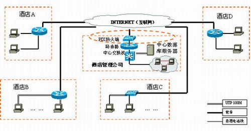 < p>系统结构整个系统采用当今最先进的技术模式——ASP模式,即所有的应用服务器软件、数据库服务器软件均安装在集团总部的中心服务器上,各酒店本地不再需要建立庞大的系统,仅需要通过Internet登录到中心服务器使用同一套系统,数据通过权限的设定相互隔离,使每家酒店感觉是在各自使用一套独立的系统。具体结构如下: p>