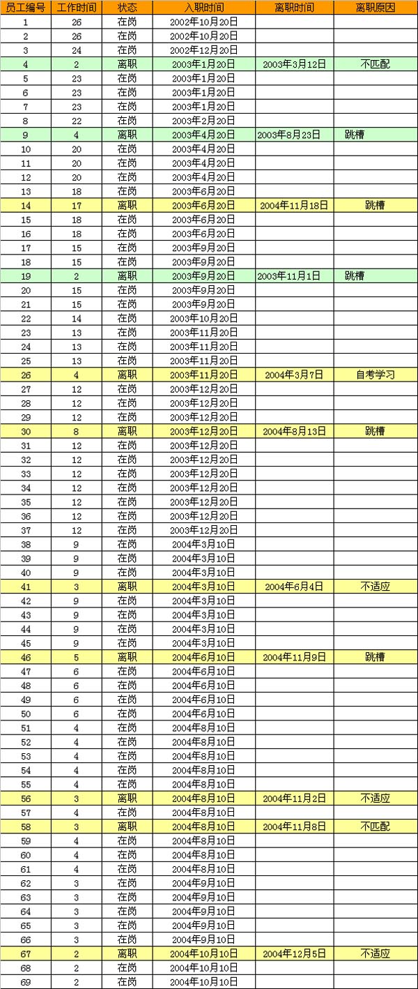 例如,某IT企业的客户服务中心,员工登记表如下图所示:2003年12月21日-2004年12月20日期间,登记在册的雇员总数为66人(由于4号、9号、19号员工2003年离职,不计入本年度员工总数中),本年度由于各种原因造成员工流失总数为8人,流失率为12.12%;在2002年12月21日至2003年12月20日期间,登记在册的雇员总数为37人,上一年度由于各种原因造成员工流失总数为3人,流失率为8.12%。