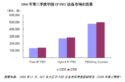根据《IDC亚太区IP PBX市场季度跟踪报告(2006年第三季度)》中国部分数据显示,2006年第三季度中国PBX系统出货量接近100万线,其中纯IP PBX占到15.1%,混合PBX占到30.9%,传统PBX占到54%。