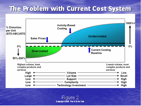 如果该行动与生产产品相联系,服务被用于把成本分配到每一个产品单元上,则一个不同的图将会出现。绿色阴影下的曲线是正确分配的成本——它是量大最不复杂的产品的曲线,成本要低得多;蓝色阴影上的曲线是量少更复杂的产品的成本。这种成本分配的方法叫做行动成本计算法,是根据生产产品和服务所需的活动量而分配的。目前的成本分配的财务方法叫标准财务法,它没有考虑涉及到生产产品和服务所需的活动量的“成本驱动因素”。这个竖轴给出了只使用标准成本分配法时,所造成真实成本失真的数量。当更多精确的行动成本分配法被使用时,我们可以更清楚地看到什么时候生产某些产品的成本实际上已经超过了其销售价格。我们卖出越多这些无利润的产品,我们的损失也就越大。