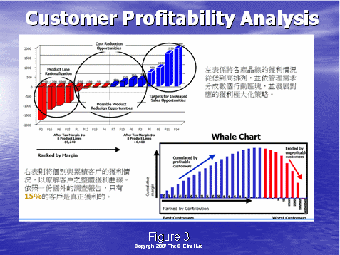 图3右下角的鲸状图进一步地说明了情况:它根据客户分配成本,而更清楚地看到客户收益性。行动成本计算或ABC可以使确保您的业务实现赢利的关键成本更清楚易懂。让我们看一个例子,来比较两种获得和保持手机用户的不同的方法。你将看到该高水平分析法可以很充分地使对呼叫中心利润的基本要素有更深的理解。