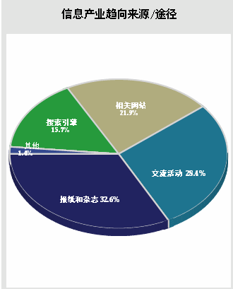 在“您的公司在哪里得知新的信息产业趋向”这个问题上,在本次调查得到的所有回复中,有32.6%的被调查者把报纸杂志作为他们的首要信息来源,而这些报纸杂志主要是CRM/CIO杂志, 以及其他各种软硬件杂志等。有28.4%的调查者认为他们的最新信息主要来源于一些交流活动,约见一些销售代表,研讨会和口述的消息(word of mouth)等,特别是研讨会,有12.14%的被调查者认为自己的最新信息主要来源于各种规模的研讨会。来源之三则是Internet, 有21.9%把相关网站作为他们的获取信息的主要来源,这些网站主要包括国内的知名门户网站新浪(www.sina.com)、搜狐(www.sohu.com)、网易(www.163.com)等。除此,还有15.7%的被调查者把搜索引擎作为他们的主要信息来源,选择使用Google的为8.33%, 选择使用百度的为7.32%。