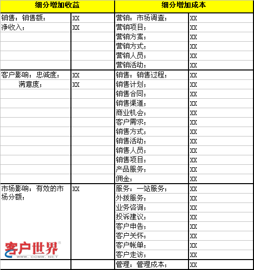 企业在实施细分策略之后,必须对细分后的客户市场的经营状况进行考察、评估。其中最基本的评估方法就是按照上表针对细分策略引起的实际新增成本与给企业带来的实际新增利益进行比较,如果收益大过成本,说明该项细分计划的实施是成功的,反之则说明细分策略存在缺陷,或者上述评估方法存在着较大的误差,必须进行误差修正或重新实施客户组合策略。