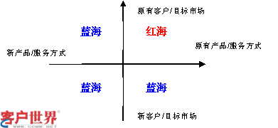 我们知道,不考虑竞争因素的话,构成市场的主体中,几个要素是非常重要的:厂商、客户、产品/服务。当若干个厂商的产品/服务相近,定位的客户群体(或市场细分)相同或相似,则自然会形成红海态势的竞争,厂商的产品及服务无法形成差异。刨除厂商这个要素,可以看到,影响到定位很重要的要素即:产品/服务方式及客户定位,联系到《蓝海战略》对市场的“蓝”、“红”划分,我们可以简单的用下图展现客户(或目标市场)、产品/服务与红海、蓝海的对应: