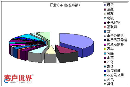 目前应用呼叫中心的主要行业有:电信(38.73%)、金融(9.62%)、邮政(5.61%)、物流(6.85%)、民航、电视购物(3.71%)、互联网、IT(3.71%)、电子及通讯、消费品及零售、交通及旅游(航空、订房订票、城市交通)、汽车、传媒、烟草(4.12%)、石化、制造、医疗保健、政府及公用(6.42%)、外包(2.1%)等。银行、保险等金融业呼叫中心的发展是最快的,通信行业呼叫中心规模保有量最大,但增速放缓。