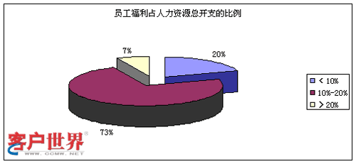 大部分企业(73%)员工福利占总开支的10%到20%,有20%企业的员工福利占总开支10% 以下,有7%企业的员工福利超过总开支的20%。