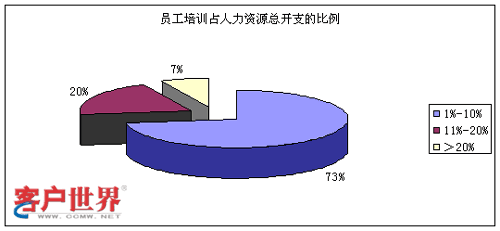 在员工培训方面,73%的企业的员工培训费用占人力资源总开支的1%到10%。
