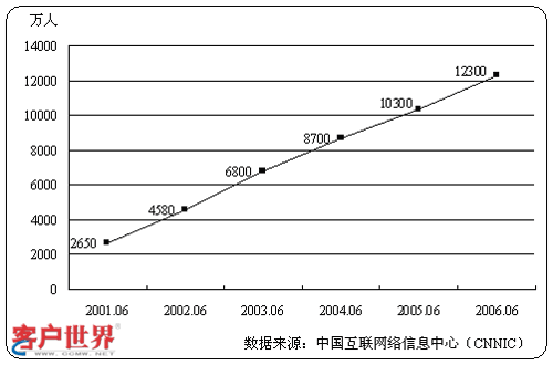 根据CNNIC第18次中国互联网络发展状况统计报告显示,截止到2006年6月30日,中国的网民总人数为12300万人,与去年同期相比增加了2000万人,增长率为19.4%,保持了近几年高速增长的态势。