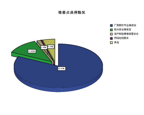 调查显示,绝大多数消费者在手机出现问题时选择到厂商授权专业维修站去维修。这部分人占有效样本的82.09%,其余11.66%的消费者选择去街头综合维修店。很少一部分人选择去信产部挂牌维修服务点或网络在线服务。