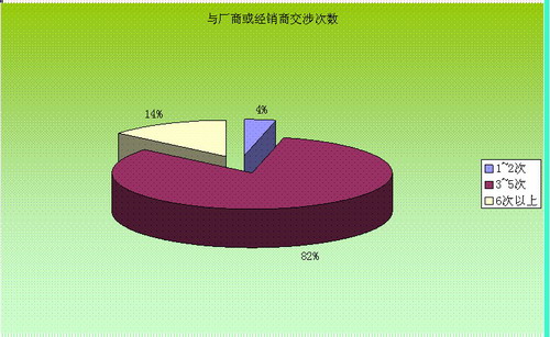手机出现问题后、需要新的手机服务或咨询时,都要与厂商进行交涉。 79.39%的消费者与厂商交涉了1~2次,另有17.64%的消费者交涉3~5次,交涉6次以上的消费者占2.97%。