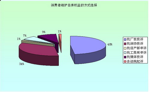 消费者通常会选择怎样的方式来维护自己的权益?在此问题的调查中,我们共得到有效样本3194份,48%的消费者选择找厂家投诉,占有效样本的将近一半,34%的消费者选择找消协投诉,另外9%的消费者去找媒体投诉,另外找工商局或信产部申诉的消费者只占7%和1%,1%的消费者选择去法院起诉。
