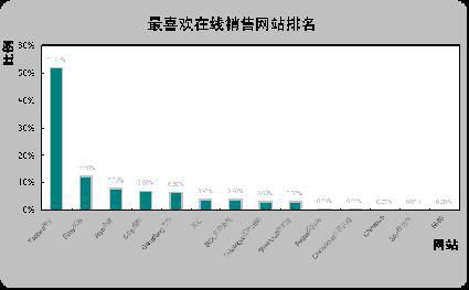 (1) 淘宝一枝独秀。从最喜欢在线销售网站排名图(如上图所示)可以看出,淘宝一枝独秀,以较大的优势领先于其他各在线销售网站,所有问卷回复者中,有51.91%的被调查者选择淘宝作为“最喜欢在线销售网站”。而国际电子商务网站巨头易趣在中国大陆市场的受欢迎度一般,只有12.20%的被调查将其作为“最喜欢在线销售网站”,远低于淘宝的51.91%。另外排名靠前的还有卓越、携程和当当,比例分别为7.73%,7.08%和6.50%。