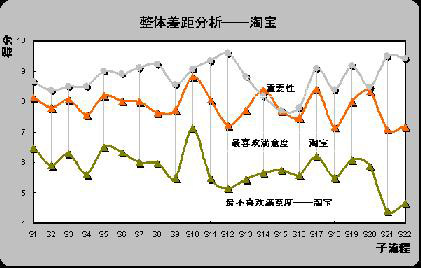 3) 重要流程仍需改善。上面提及,虽然淘宝的被欢迎程度较高,但同时也有一定比例的被调查者仍然将其列为最不喜欢在线销售网站,从计算可以得出,在淘宝满意度和所有流程重要性评分差距中,差距最大的三个流程分别为S21(退换货服务), S12(产品质量可靠)和S22(客户投诉和反馈),具体差距分别为2.44,2.38和2.22。也是重要性评分排名前三位的子流程。虽然淘宝成为用户最喜欢的在线销售网站,但在重要子流程上并未为用户设计最佳体验。