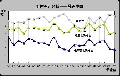 1) 两条满意度曲线走向一致。如上图中选择易趣中国作为最喜欢在线销售网站和最不喜欢在线网站的被调查者的满意度曲线可以发现,两条体验曲线的走向基本一致,有几乎相同的“峰”和“谷”。