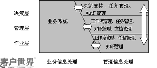 到目前为止,很多企业的信息化应用还停留在企业基层的业务管理阶段,整个企业内部的管理应用还十分有限,由于基层业务处理系统具有流程和功能固化的特点,对于千差万别、千变万化的企业实践来说,往往容易造成这样一些现象:一个部门经理由于工作疏忽而忘记了审批单据,却得不到及时的提醒,结果导致业务系统的阻塞;一个重要的市场信息由于无法在信息系统中体现,而不能及时被企业高层和相关部门了解;下发的公文需要用传真或电子邮件一封一封的发送并打电话确认;企业高层必须接受业务系统的培训并一个一个地打开业务处理系统的窗口才能得到想要的数据;企业的业务系统运行的很好,却还需要经常开会讨论一些日常安排……