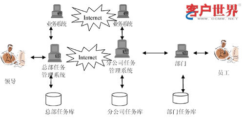 任务管理系统是通过工作棒(工作任务)的定义和管理,使工作任务受控,达到资源合理使用和员工协同工作的目的。一项任务(工作棒)及其相关资源(部门、人员数量)、时间、关系被定义后,经层层分解到各分、子公司直至部门、人员,子任务被放到“部门工作库”中,成为月、周甚至天、时“工作棒”。部门经理根据本“部门工作库”各段时间中的子工作棒安排员工工作计划,就像用“工作棒”去填充一个个“工作框”。当“工作棒”超过“工作框”的容量时可以自动报警,使工作均衡协调。若取消某工作框,工作棒将自动弹回上级工作库。在工作棒分配过程中,可以实现互动式管理:任务过多,可以报警甚至弹回任务;任务完成,下级可以申请加任务。最后还可以进行查询、控制,对员工任务完成情况、企业人力资源利用情况进行统计。任务管理系统的架构图如下: