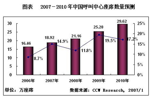计世资讯(CCW Research)的研究成果《2006-2007年中国呼叫中心市场研究报告》预计,2007-2010年中国呼叫中心的产业投入规模平均年度复合增长率将超过20%,预计2007年中国呼叫中心投入规模将达到337.19亿元,同比增长24.8%。由于2007、2009两个年度中国呼叫中心将开始更换新的系统平台,并开拓远程座席市场,因此2007年的呼叫中心座席规模增长率高于2006年,2009年的呼叫中心座席规模增长率高于2008年。预计2007年中国呼叫中心座席数量将达到18.92万个,同比增长14.9%;而2006年呼叫中心座席数量的同比增长率仅仅是8.7%,可见2007年的增长率比2006年的高出6.2个百分点。计世资讯(CCW Research)研究认为,2007年成为中国呼叫中心产业发展的转折点,2007年中国开始进入第二波呼叫中心建设高潮期。