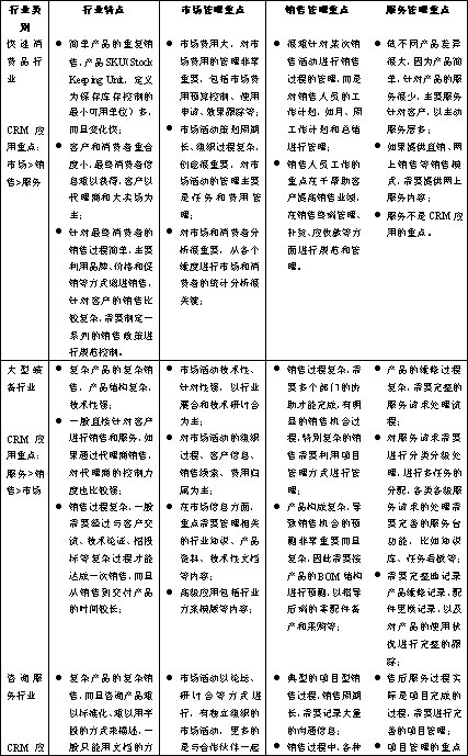 从以上简单的分析过程我们可以看出由于企业所处行业特点的不同,导致在市场、销售和服务方面对CRM主要功能需求差别非常大。企业在实际选型过程中,还需要对行业再进行细分分析,比如在快速消费品中,洗涤用品行业和牛奶乳业行业在客户服务的主要需求等方面就有比较大的差别,这些都需要细致的分析。