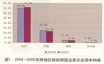电信增值市场的开放和政策环境的优化,也吸引了众多的外资企业。电信增值服务的投资来源、经营主体、服务目标、经济功能与基础电信业务存在明显差异,彼此间有竞争关系,但更多的是补充、丰富的关系。目前,我国已放开电信增值市场准入,从2005年起,整个电信增值业务市场就呈现出持续快速发展的势头,民营资本已经发展成为电信增值业务领域的主力军,其所占企业数量比例已超过70%(见图1)。
