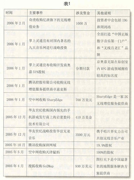 从2003年开始,国内就显现出并购增值服务运营企业的苗头。2004年以来,随着整治增值服务运营企业的力度不断加大,并购渐成风潮(见表1)。2004年2月,新浪收购深圳网兴科技公司;2004年5月,搜狐收购手机WAP服务提供商北京吉菲尔公司。2005年,在“超级女生”节目大获成功后,掌上灵通宣布将对国内著名的九天音乐网进行战略投资,全面打造“中国正版数字音乐第一门户”和“无线百老汇”品牌。各大移动增值业务服务商通过并购竞争对手,门户网站可以在移动增值服务领域寻求新的突破,获得可观的利益,增强自身的竞争力。伴随着3G商用的日益临近和市场竞争的不断加剧,主流SP(服务提供商)进一步加快了资本购并和业务整合的步伐,整个SP行业将加速洗牌。经过市场整合,主流SP将不断做大做强,而相当多的缺乏市场竞争力的SP将被淘汰出局。