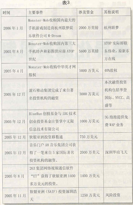 近几年来,一些资本投资商将投资的重点放到了无线音乐、手机游戏和手机视讯等业务领域,逐步加大了对SP的投资力度(见表3)。进入2005年以来,着眼于2.5G向3G的全面演进,风险投资对SP的投资力度进一步加大。以滚石移动为例,在2002年和2004年获得两轮风险投资之后,滚石移动凭借在无线音乐领域取得的良好市场业绩,又获得了智基创投、华登国际、联想投资等公司的投资,投资金额达3000万美元。继2004年10月获得IDG投资以后,2005年12月7日,国内著名的数字音乐门户——A8音乐集团获得了包括IDG和Intel投资公司在内的5家国际著名投资机构的投资,投资金额达2000万美元。同月,掌中无限则获得了来自全球性风险投资商BlueRun创投基金和IDG总额达上千万美元的投资。