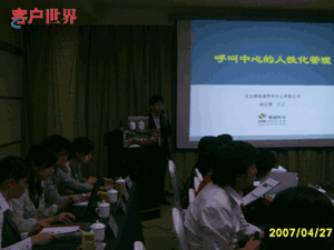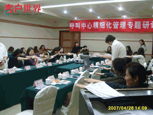 4月26日,北京:“呼叫中心精细化管理之(二)——呼叫中心现场管理岗位设置及核心能力提升专题研讨会”在北京凯康国际酒店圆满落下帷幕。客户世界机构(CCMWorld Group)统筹规划和协调管理之下,结合市场的要求和实际情况组织实施了多场公开培训的系列课程,在业界具备良好的口碑。2007年全年的公开研讨课程以“呼叫中心精细化管理”为主题,紧扣呼叫中心运营过程中的各主要业务职能进行组织。