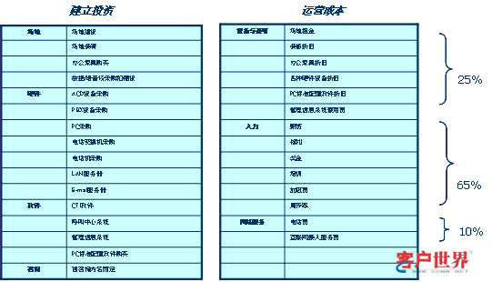 接下来我们要讨论的第二个问题是呼叫中心的直接成本构成,我把它主要分为两大部分,第一部分是建立投资,我们通俗地称它为一次性建立成本,一般企业都是用3年或5年来进行摊销折旧的(所以也可以把它全部折算到运用成本中,但当中最大的区别就是时效性的问题);第二部分是运营成本,这是日常性成本,就象人活着就要吃饭一样,每天都要产生的费用,免不了。
