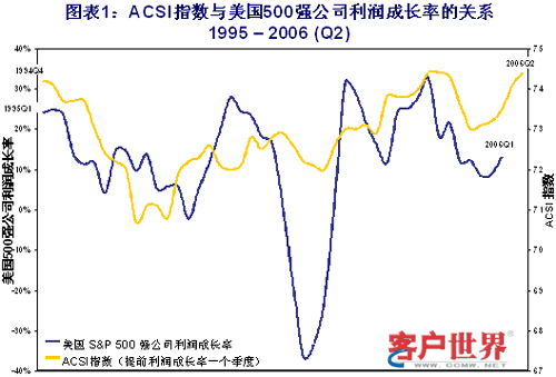 科罗思·费耐尔教授的研究表明,美国客户满意度指数(ACSI)与美国500强企业的利润增长率有着密切的相关性(见图表1)。ACSI指数是由美国密歇根大学Ross商学院与美国质量学会(ASQ)以及科罗思咨询集团(CFI Group)共同研制的。自1994年创建以来,ACSI指数作为每季度衡量美国经济状况的重要指标之一,已成为与消费品价格指数、失业率和通货膨胀率同等重要的经济参数。ACSI指数涵盖了美国40个产业的200家公司和政府机构,几乎占全美国经济的二分之一。每年要做超过70,000名客户的市场调查。ACSI指数被证明是公司收入、Tobin’s q、市场增值、净现金流量、现金流动的稳定、消费者支出和国民生产总值增长的导向指示器。